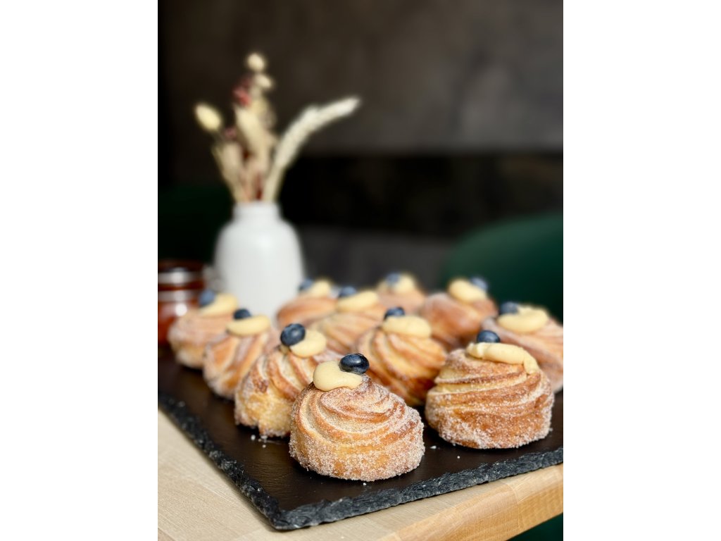 Croissant v podobě muffinu obalený skořicovým cukrem.